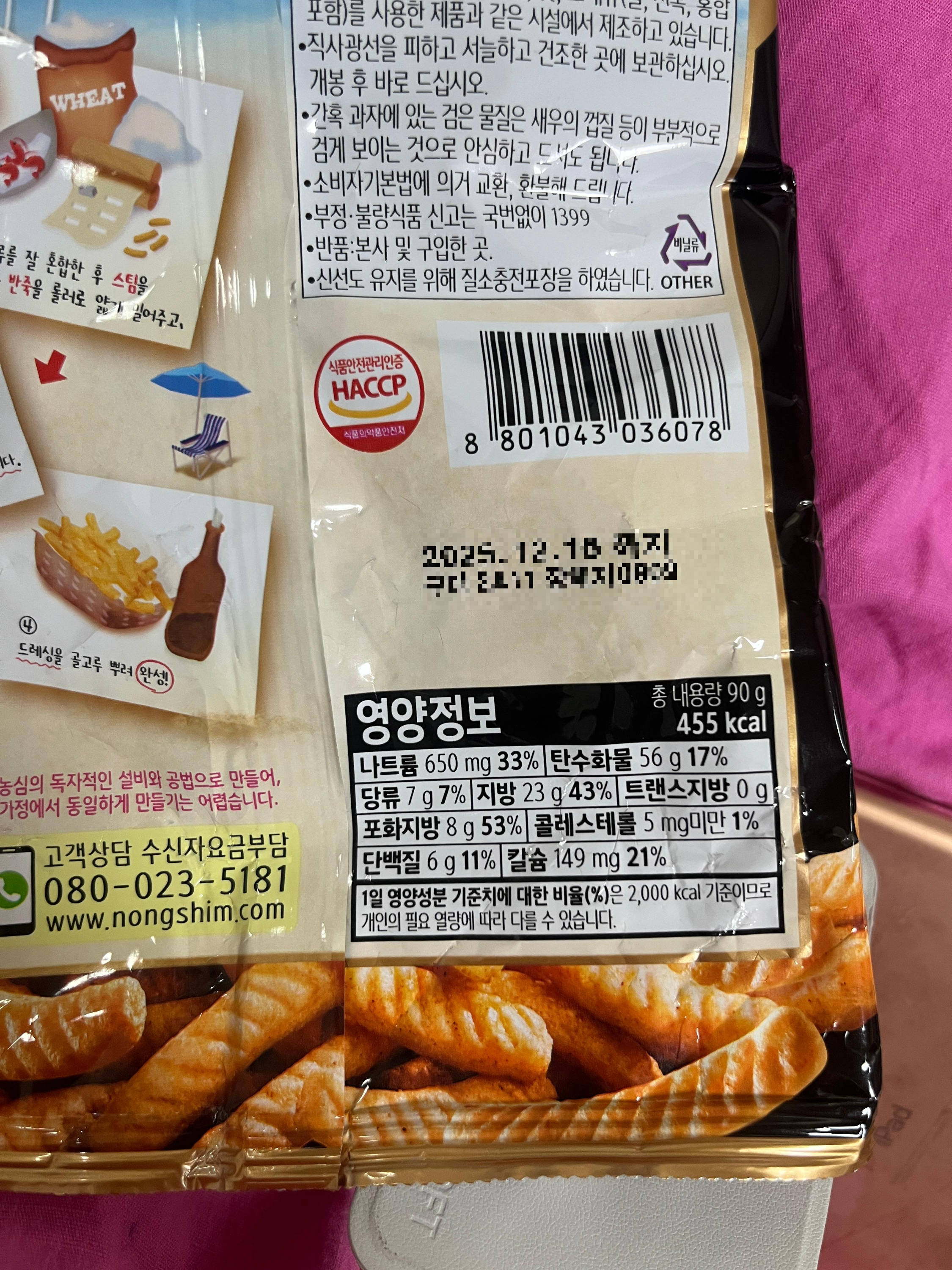 - 원재료: 쉬림프크래커(중국산: 소맥분, 옥수수분말, 새우, 맛베이스조미분말, 변성전분), 미강유(태국산), 팜유(말레이시아산), 매운맛시즈닝, 매콤한풍미유